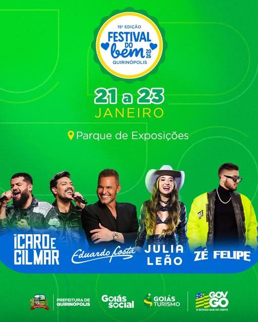 Quirinópolis se prepara para viver três dias de muita festa, música e celebração em comemoração aos seus 82 anos de emancipação. Entre os dias 21, 22 e 23 de janeiro, o município realiza a 15ª edição do Festival do Bem, um dos maiores eventos culturais da região, que já se consolidou como tradição no calendário festivo da cidade.