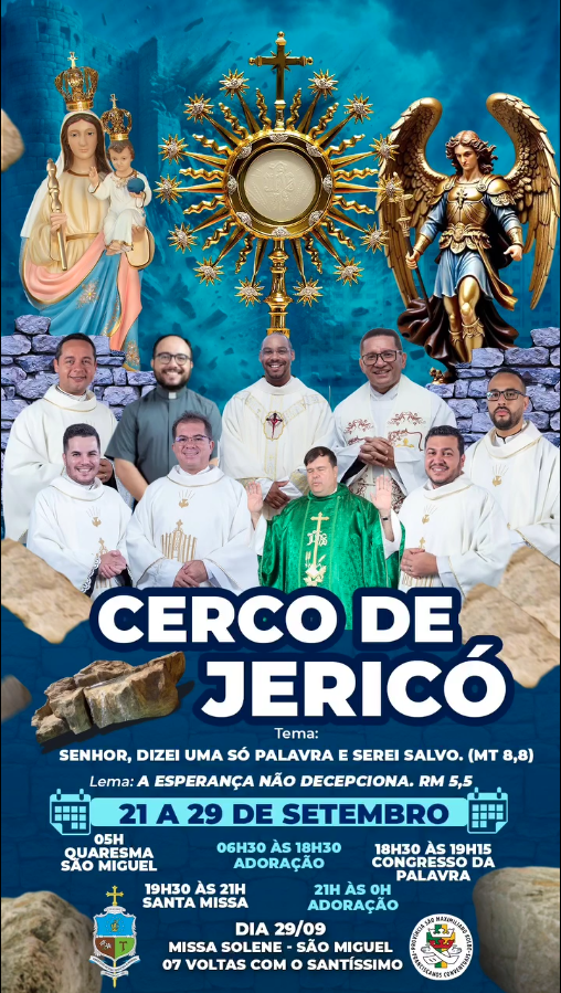 De 21 a 29 de setembro, a comunidade católica de Quirinópolis viverá o Cerco de Jericó, uma poderosa semana de oração e louvor que será realizada na Igreja Matriz. O evento é considerado um dos momentos mais fortes de espiritualidade do calendário religioso, reunindo fiéis em busca de bênçãos e renovação espiritual.